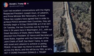 תוך כדי שנתניהו מכנס את הקבינט לדון בהפסקת אש מול לבנון, טראמפ מיהר לצייץ: לבנון וישראל יפתחו הלילה רשמית בהפסקת אש של עשרה ימים.